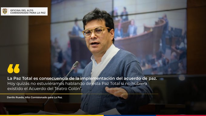 Por su parte el Comisionado Rueda, manifestó que la paz total propuesta por el presidente de Colombia, Gustavo Petro, “es consecuencia y derivación de la implementación del Acuerdo de Paz, si no se estuviera implementando el acuerdo, seguramente no estaríamos hablando de la ‘Paz Total’.