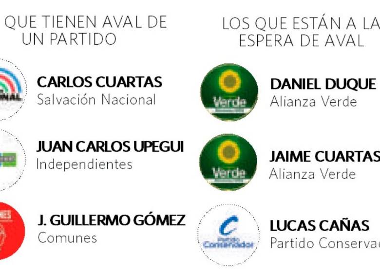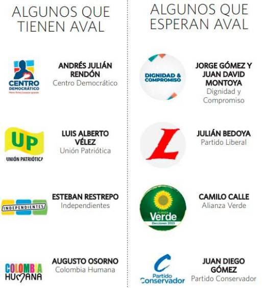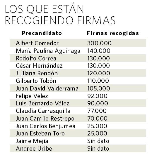 La mayoría de los que ya saltó al ruedo eligió el camino del aval por firmas, para lo cual inscribieron grupos significativos de ciudadanos ante la Registraduría y hoy siguen en la tarea de recolección; solo la exconcejala del Centro Democrático María Paulina Aguinaga informó que presentó ayer 140.000 firmas en la Registraduría. Para recoger firmas también inscribieron movimientos Germán Gutiérrez, William de Jesús Henao, Luis Fernando Tabares, Juan Gabriel Toro, Jhon Bazurto, Alberto Araque, Jorge Iván Rojas, Maximiliano Valderrama y Benito Gómez, a quienes no logramos contactar para este artículo. Santiago Jaramillo también inscribió uno, pero dejó de recolectar firmas y está a la espera de que algún partido lo avale.