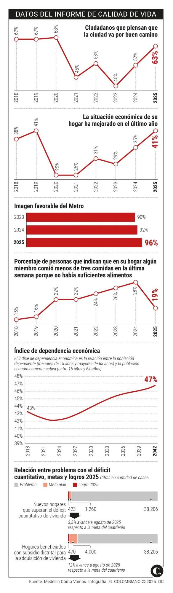 Medellín atraviesa un momento de recuperación anímica e institucional tras varios años de turbulencias. Así lo concluye el más reciente informe de calidad de vida y la encuesta de percepción ciudadana del programa Medellín Cómo Vamos, presentado este miércoles y que evalúa desde la situación económica hasta los cambios demográficos, la vivienda y las brechas sociales.Aunque los indicadores muestran una ciudad que recuperó la confianza, el reporte advierte que persisten desafíos profundos, especialmente en materia de pobreza infantil, déficit habitacional y riesgo urbano.